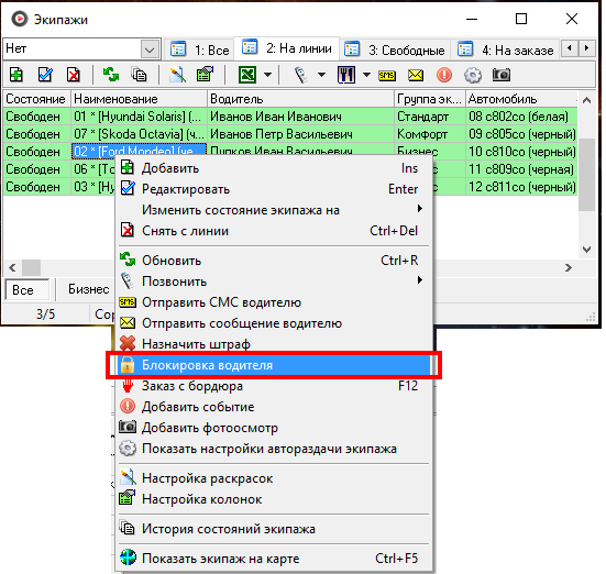 Выпадающее меню пункт Блокировка водителя